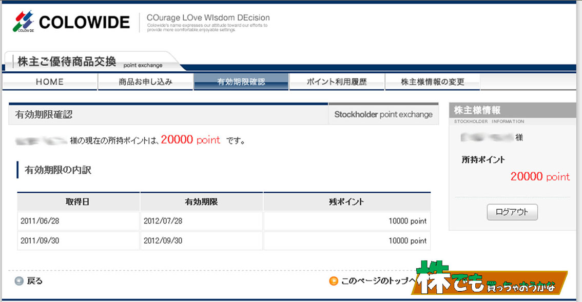 9月30日に、7月1日に届いた株主優待カードのポインドと10000点が追加になっていました。