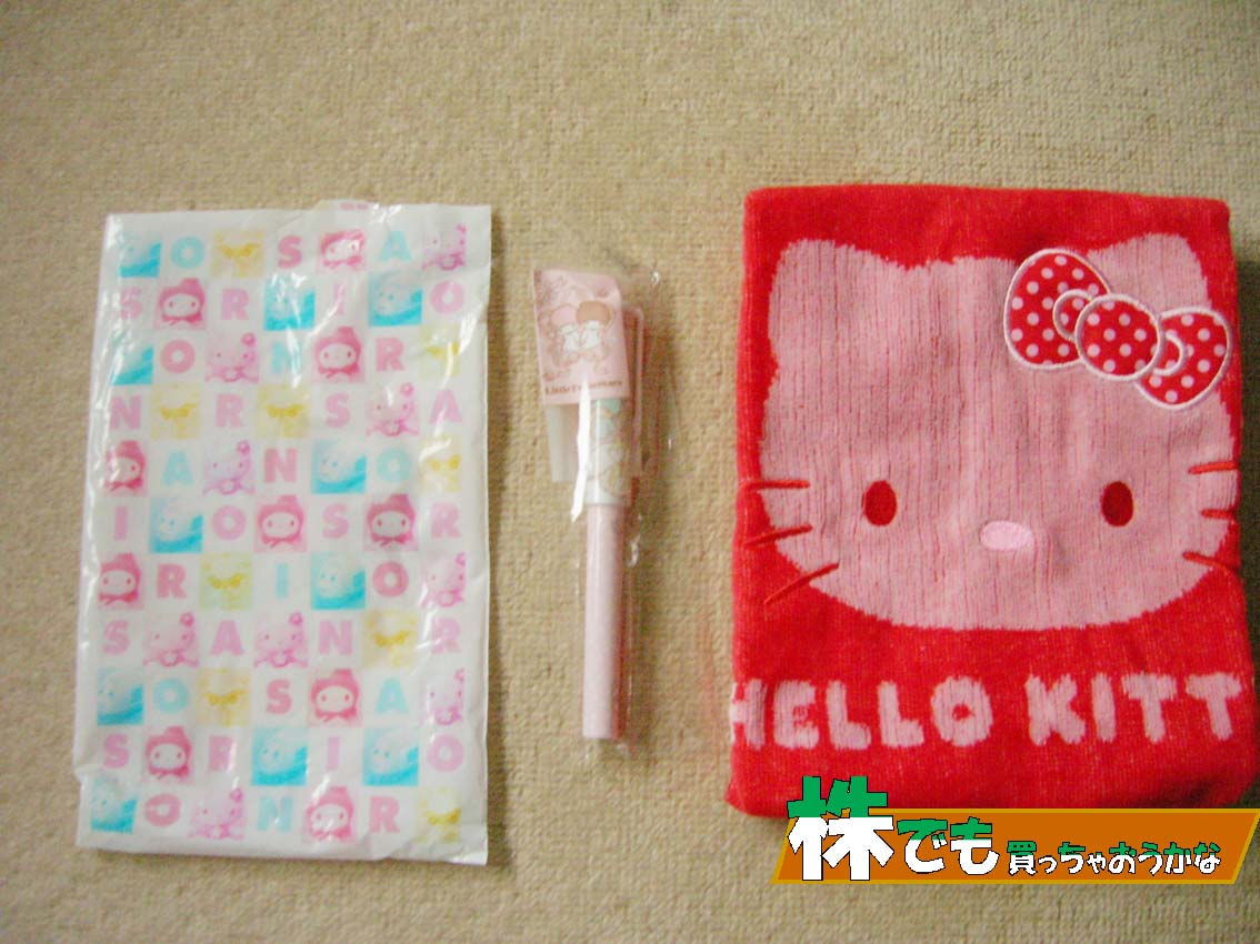 おみやげにキキララのボールペンとキティちゃんのハンドタオルをもらいました。