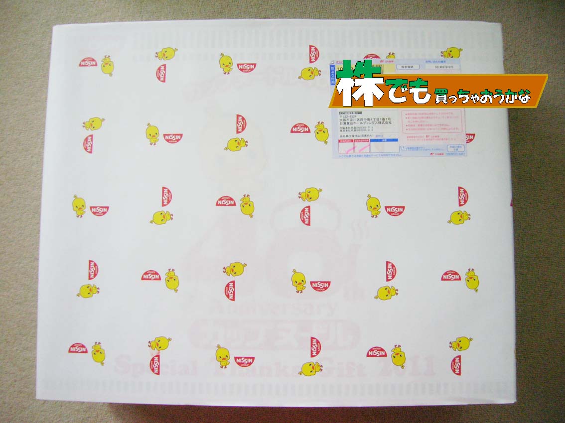 株主優待が入っていた箱にも、包装紙にも、日清のキャラクター『ひよこちゃん』が印刷されています。