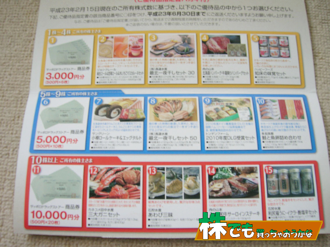 所有の株数により、品物が変わりますが、5つの中から選択できます。今年の正月に買い物に行こうと思って株主優待券を探してると、去年の返信ハガキを見つけました。返信期限が遅れていたので、半ばあきらめながら、送り返すと2週間後に優待券が届きました。このお礼を今年の返信ハガキに書き送りました。家の近くに、サッポロドラッグストアの店舗があるので、今年も商品券にしました。