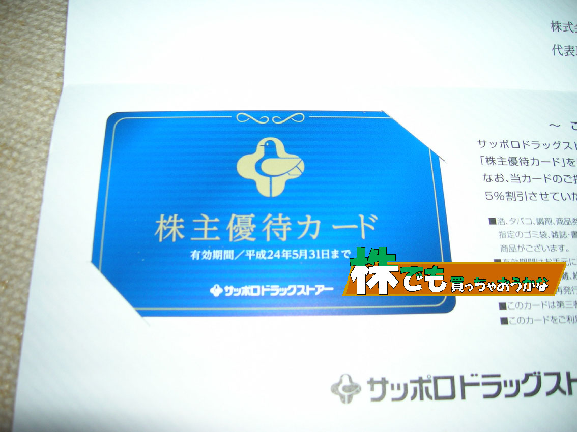 また、今年から株主優待カードがもらえることになりました。お店で5%引きになるそうです。でも、北海道の株主しか使えないので、道外の株主はいらない気がします。株主総会では、社長がサツドラの株主の半分は道外の方なので、全株主に公平にならないと言っていたのですが・・・ね。個人的にはとてもうれしいです。